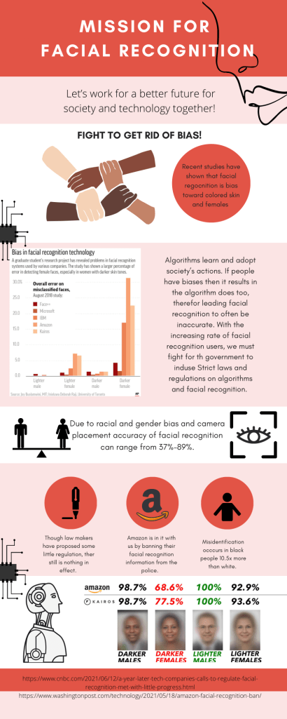 This infographic that I created was for my DCIM Capstone course. It is about the mission to encourage laws and regulations for facial recognition. My design includes a strong color like red so it can gain attention and show importance.