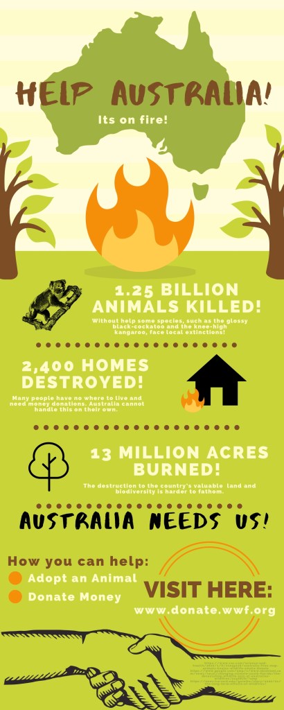 The infomercial that I created was to correspond with a news analysis paper I wrote for a class. I researched and collected data from several news sources about how the tragic Australian Wildfires that began mid 2019. To achieve the look of the infographic I utilized a cite called Canva. The strategy I used to create the design is first by recognizing my target audience. My target audience was recognized to be college students, earth lovers, and animal lovers. I utilized a new trend “boho theme” with all white, some greens and beige. I followed a design that will intrigue my target audience by incorporating those colors and pictures of animals. My infographic also includes information about what the future has in store for Australia after the wildfires and where to go to help.